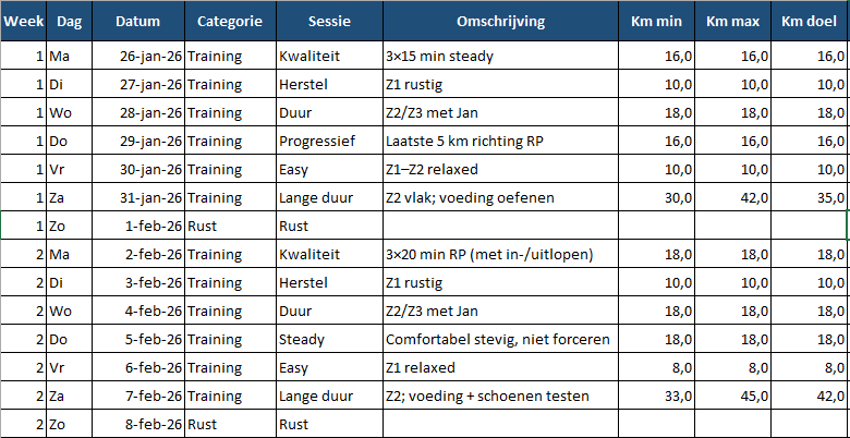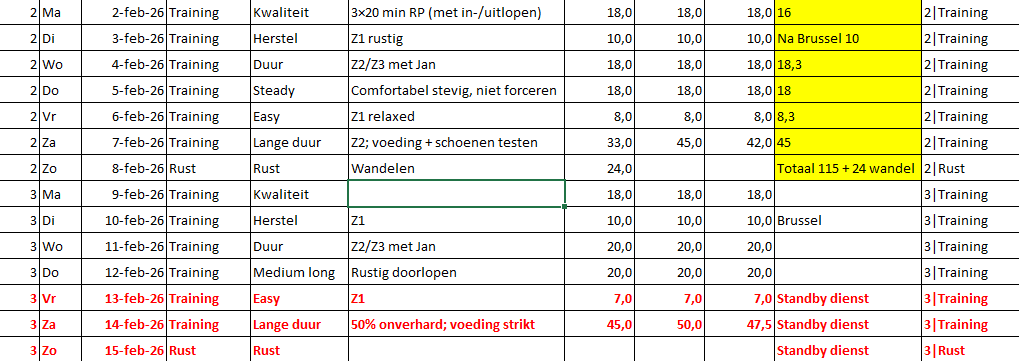 Dus: boeken erbij gepakt, het internet afgestruind en uiteindelijk — via ChatGPT — alles in een Excel-sheet gegoten. Daarna nog wat geschoven, zodat de rustige herstelloopjes op dinsdagen vallen, wanneer ik op en neer naar Brussel moet. De rustdagen heb ik op zondag gepland, omdat Maaike dan vaak andere plannen heeft.