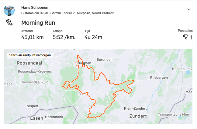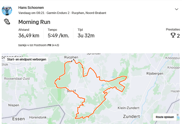De duurloop van vandaag had ik gepland tussen de minimaal 30 en maximaal 42 km, en uiteindelijk heb ik er 36 km van gemaakt. Dat is het fijne van een min/max-planning: loop je daar netjes tussenin, dan voelt het alsnog als een geslaagde training.