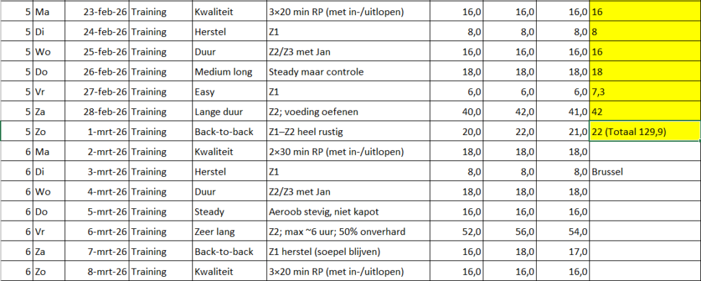 Nu begint het echte zware werk. Twee piekweken waarin het volume nog verder omhoog gaat. Gelukkig werkt het weer mee en kon de korte broek weer uit de kast. Dat maakt lange trainingen toch net iets aangenamer. Als het lichaam blijft meewerken, dan bouwen we rustig verder richting Texel.