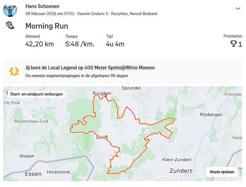 Zaterdag begon ook stroef. Een wat pijnlijke linker voet, lichte klachten in nek en rug — niet ideaal. Gelukkig trok dat grotendeels weg zodra ik het bos in ging.