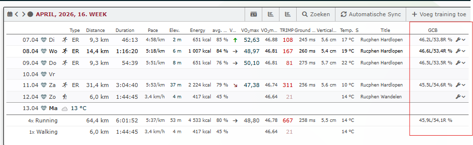 Ook de kracht in mijn linkerbeen is flink afgenomen. Dat zie je terug in de zogenaamde ground contact balance. Links is die nu 5% lager dan rechts — nog nooit zo laag sinds ik deze gegevens meet met mijn Garmin.