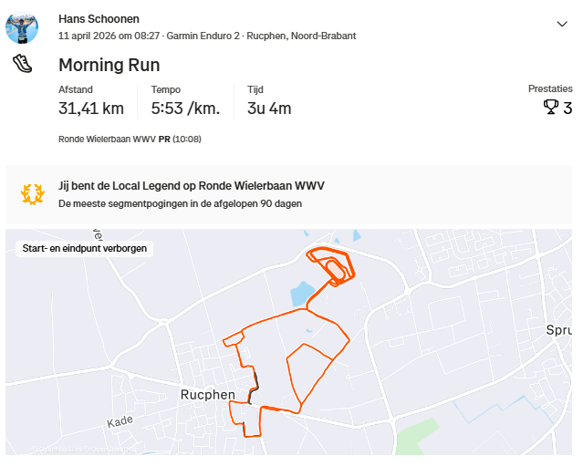 Daarna ging ik alleen verder. Afwisselend liep ik rondjes op de atletiekbaan en de wielerbaan. Uiteindelijk zat ik op ongeveer 29 km en vond ik het mooi geweest. Tijd om naar huis te gaan.