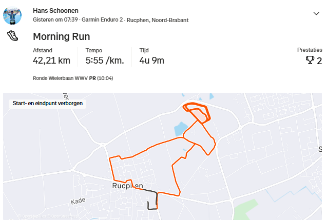 Ik liep nog 8 km door op de baan en maakte vervolgens de laatste 2 km naar huis vol, ook goed voor een mooie marathonafstand.