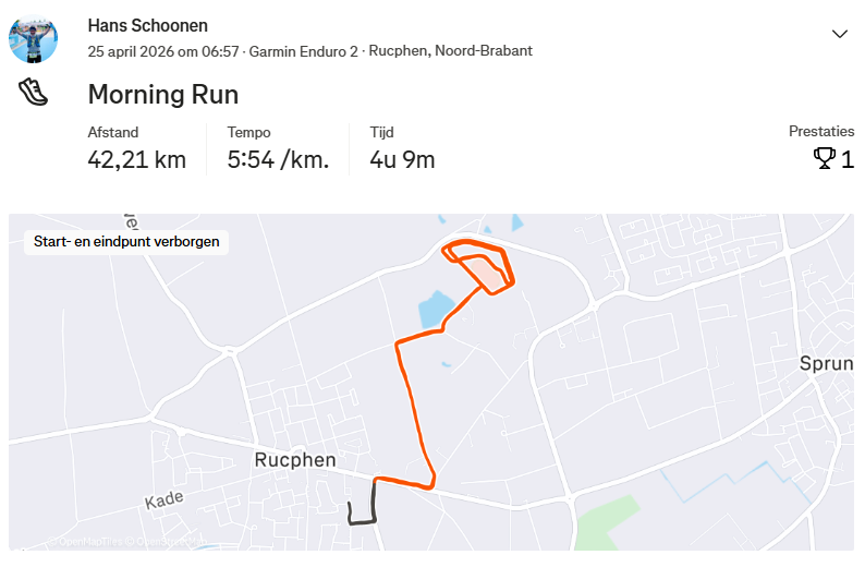 Nu dus weer wat kortere afstanden lopen en langzaam wat meer rust nemen, zodat ik in Sittard goed uitgerust aan de start kan verschijnen. Hopelijk zit het dit keer een beetje mee, want na twee DNF’s moet het nu toch een keer lukken om mijn PR uit 2022 te verbeteren.