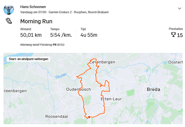 Alles bij elkaar opgeteld ben ik dus erg tevreden. Zoals zo vaak vlogen de kilometers al pratend voorbij. Na vijf uur drukte ik mijn Garmin uit en wenste Jan een prettig weekend — hij moest immers nog een stukje door.