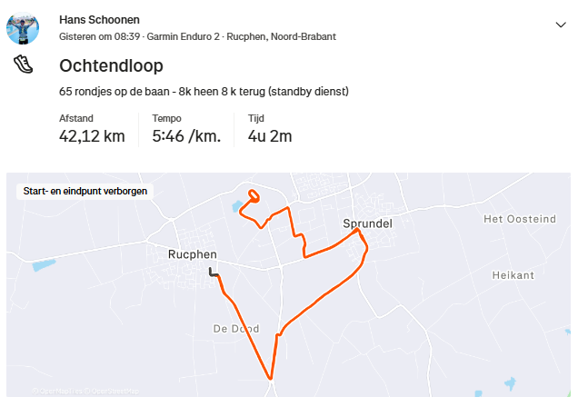 Omdat er inmiddels wat collega’s weg zijn, draait die dienst wat vaker dan me lief is. Het beperkt je behoorlijk, en vooral de onzekerheid tijdens het hardlopen maakt het lastig: elke training kan zomaar onderbroken worden. Dus ook dit weekend aangepast trainen en vooral in de buurt blijven.